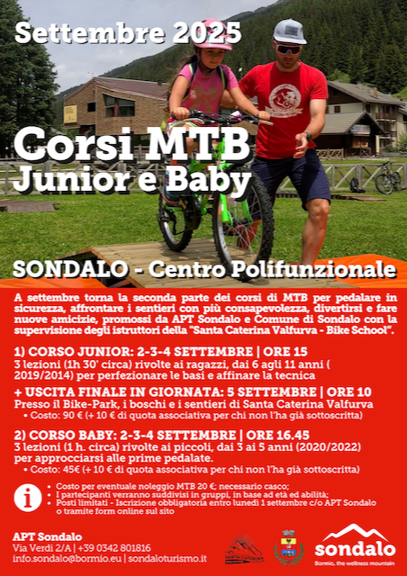 A settembre torna la seconda parte dei corsi di MTB promossi da APT Sondalo e Comune di Sondalo, con la supervisione degli istruttori qualificati della "Santa Caterina Valfurva - Bike School". I corsi sono pensati per far acquisire ai bambini maggiore consapevolezza sui sentieri, migliorare la tecnica e, perché no, fare nuove amicizie pedalando.