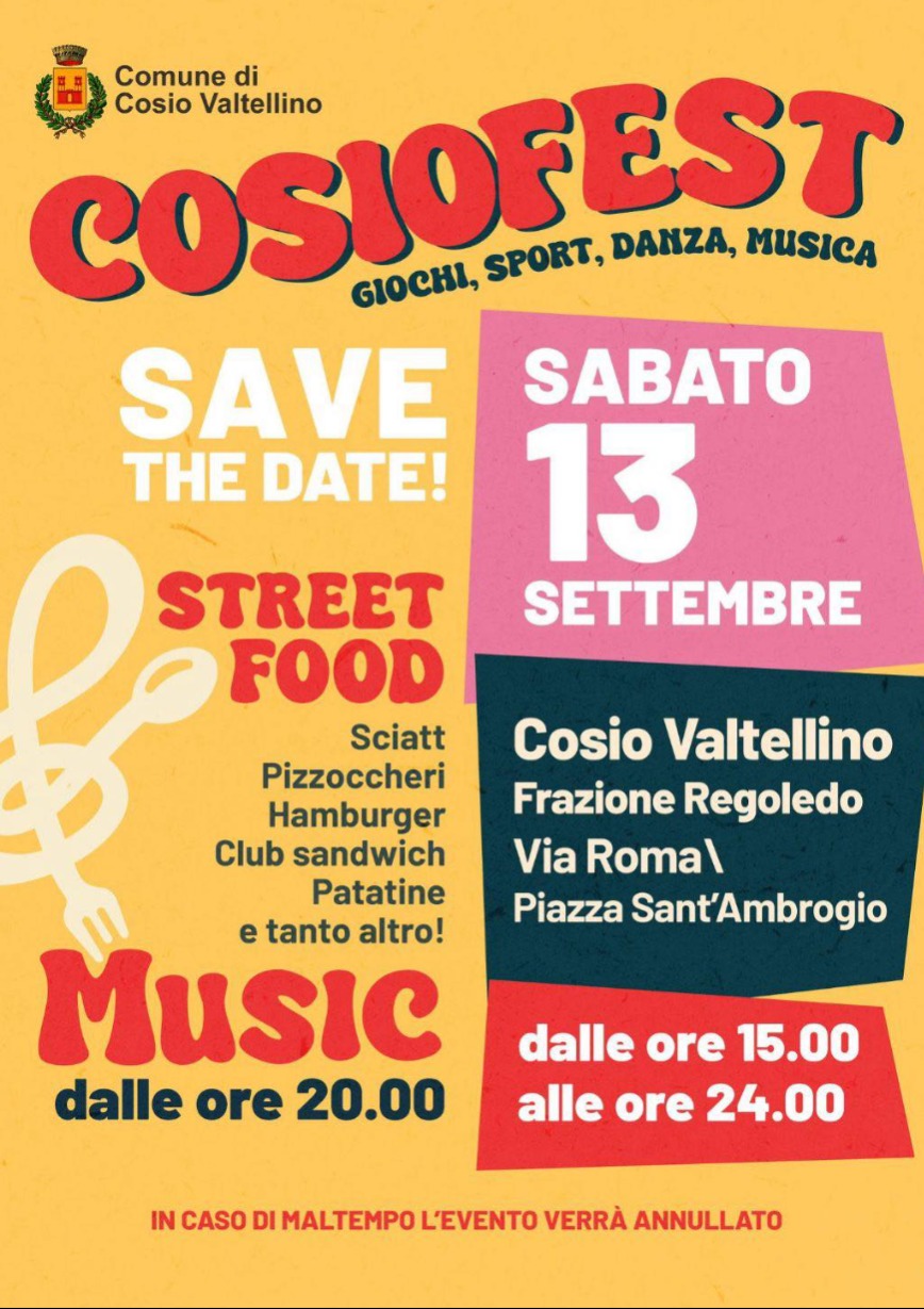 Sabato 13 settembre 2025 torna COSIOFEST, l’evento più vivace dell’anno a Cosio Valtellino (SO), nella frazione di Regoledo.