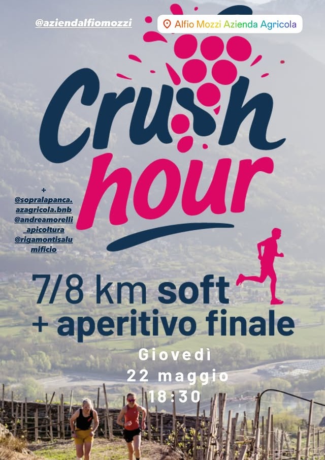 Se ti piace l’idea di una corsa soft al tramonto con un buon calice ad aspettarti alla fine… allora Crush Hour è l’appuntamento perfetto per te.