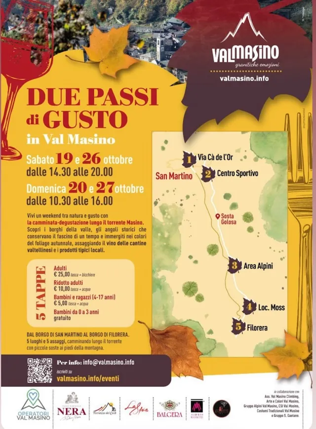 Se ami la natura, il buon vino e le tradizioni locali, non puoi perdere l’evento "Due Passi di Gusto" in programma il 19 e 20 ottobre 2024 e 26 e 27 ottobre in Val Masino. Una camminata degustazione lungo il torrente Masino ti porterà a scoprire angoli nascosti e panorami mozzafiato, il tutto accompagnato da assaggi di prodotti tipici e vini valtellinesi di alta qualità.