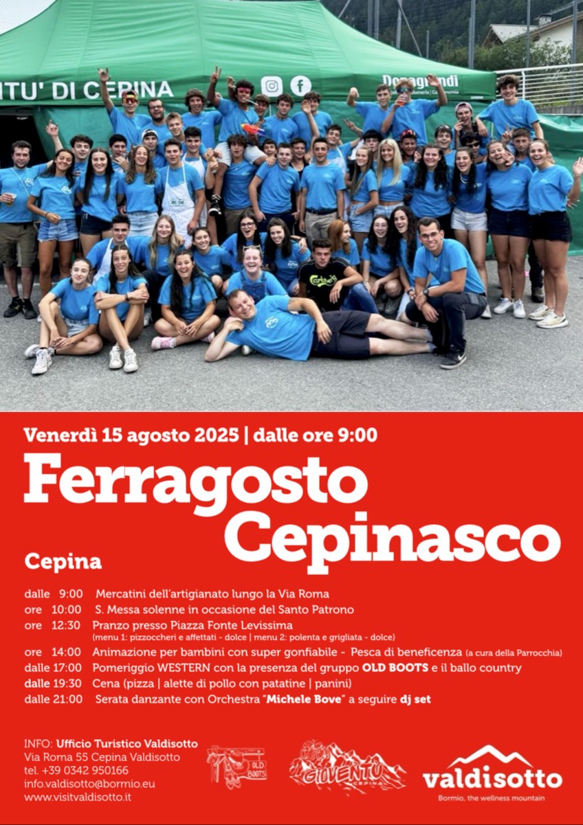 Il 15 agosto 2025 a Cepina (SO) si festeggia S. Maria Assunta, patrona del paese, e come da tradizione la giornata si riempie di eventi, musica, buon cibo e voglia di stare insieme. La Gioventù di Cepina, insieme alla Parrocchia, organizza anche quest’anno il Ferragosto Cepinasco, una festa che sa unire spiritualità, tradizione, artigianato, giochi e allegria per tutte le età.