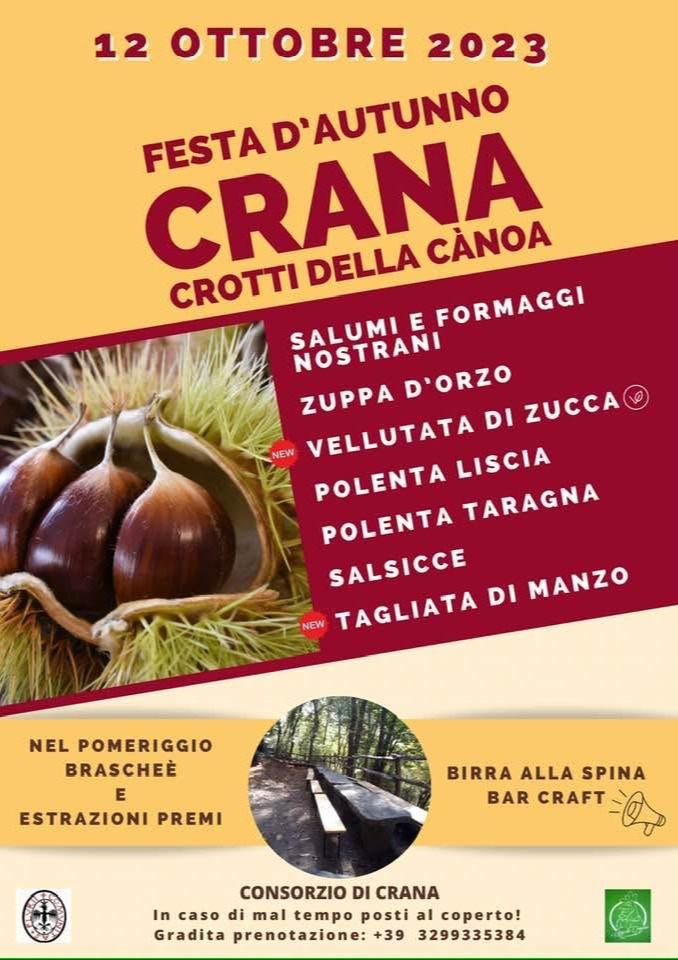 Hai voglia di passare una domenica semplice ma piena di gusto? Allora segna in agenda questa data: 12 ottobre a Crana (PIURO – SO) si celebra l’autunno con una festa genuina, tra buon cibo, castagne, birra artigianale e momenti di condivisione sotto i Crotti della Cànoa.