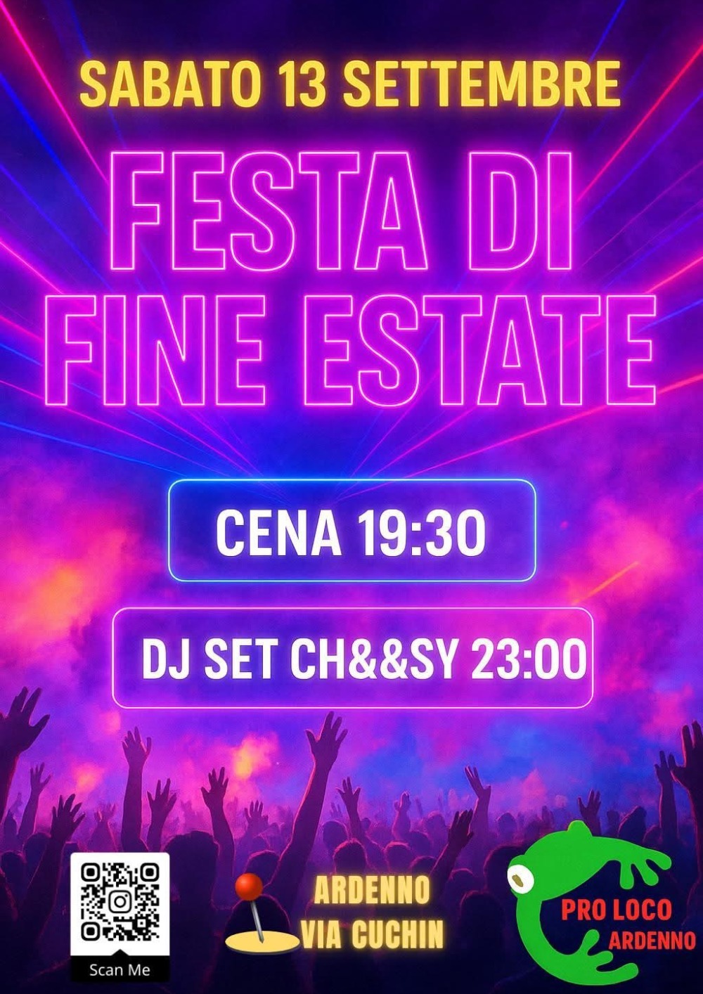 Hai voglia di salutare l’estate con la giusta carica? A Ardenno (SO) ti aspetta un sabato sera carico di musica, buon cibo e divertimento con la Festa di Fine Estate organizzata dalla Pro Loco di Ardenno! 🎉