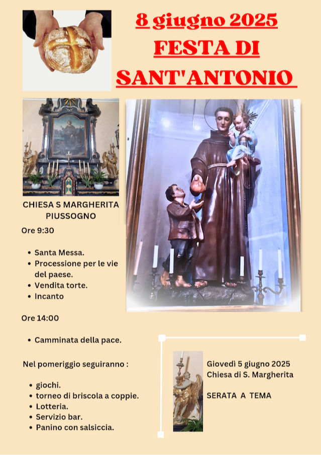 Una giornata di comunità, fede e allegria in uno dei borghi più autentici della Valchiavenna. Domenica 8 giugno 2025, torna l’attesissima Festa di Sant'Antonio a Piussogno (SO), con un programma che unisce momenti religiosi, convivialità e divertimento per tutte le età.