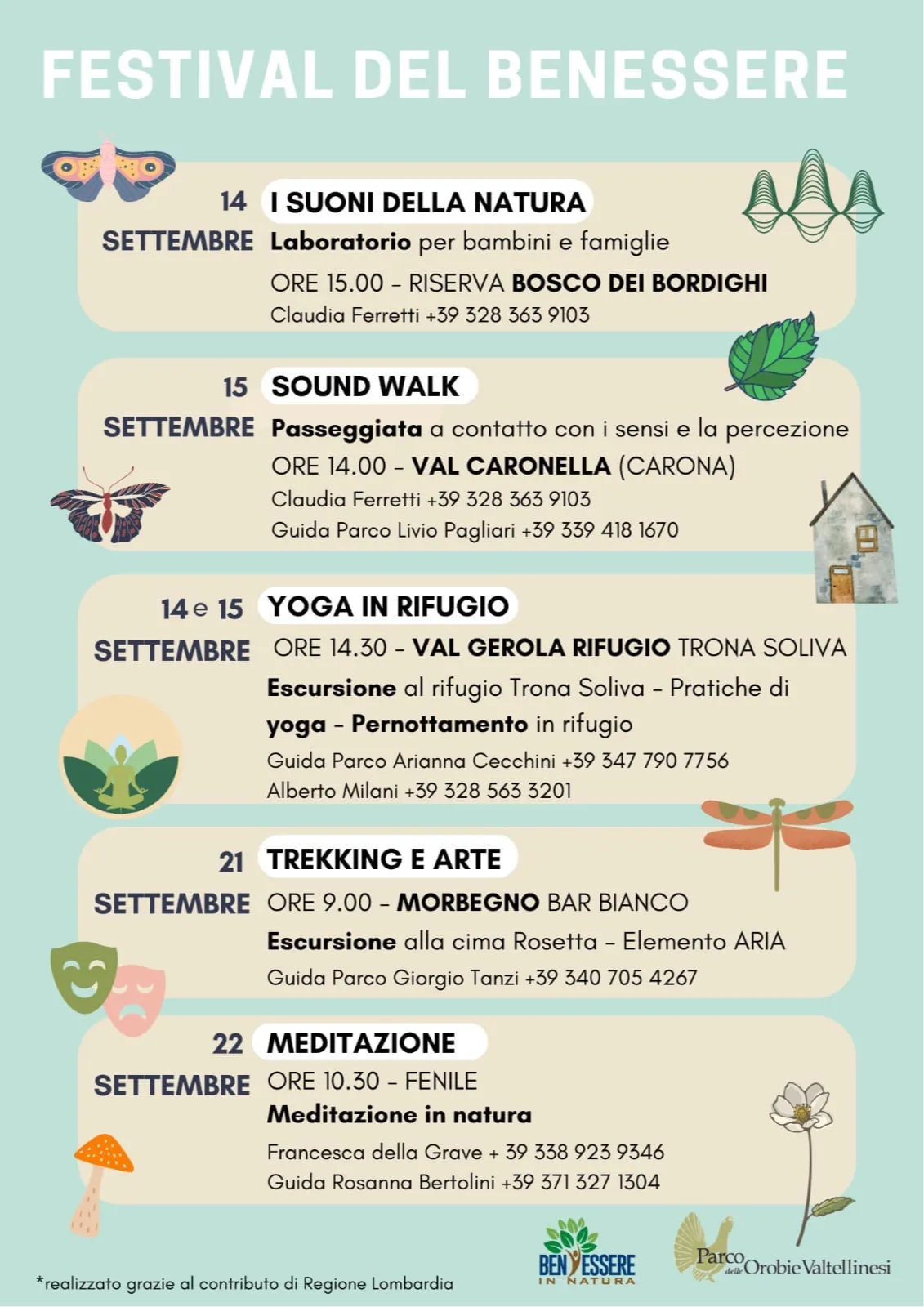 Due weekend dedicati al benessere nella natura, grazie a un progetto finanziato dalla Regione Lombardia e organizzato da AREA Parchi, con la partecipazione del Parco delle Orobie Valtellinesi che propone diverse attività.