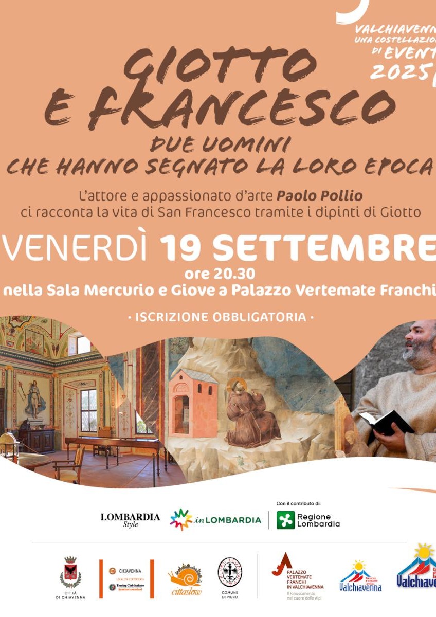 Venerdì 19 settembre, alle 20.30, nella suggestiva Sala Mercurio e Giove del Palazzo Vertemate Franchi, l’attore e appassionato d’arte Paolo Pollio racconterà la vita di San Francesco d’Assisi attraverso i dipinti del grande maestro Giotto.