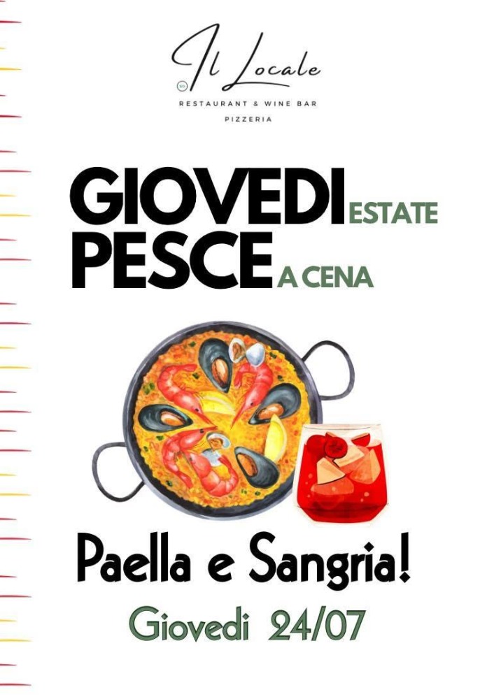 In occasione di "Giovedì d'estate Pesce a cena", Il Locale propone una serata a tema spagnolo con una paella preparata al momento, ricca di pesce e ingredienti freschissimi, e sangria artigianale, profumata e ghiacciata, perfetta per accompagnare la cena nelle sere calde d’estate 🇪🇸☀️