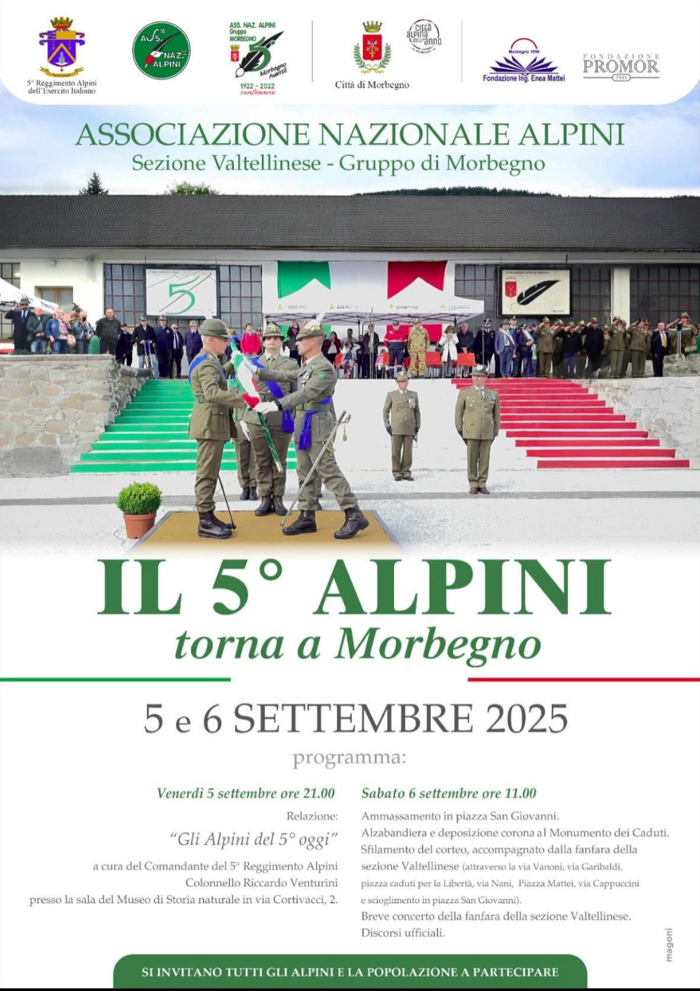 Il 5 e 6 settembre 2025 a Morbegno (SO) si celebra il ritorno del 5º Reggimento Alpini, con un ricco programma tra cerimonie, sfilate e momenti commemorativi.