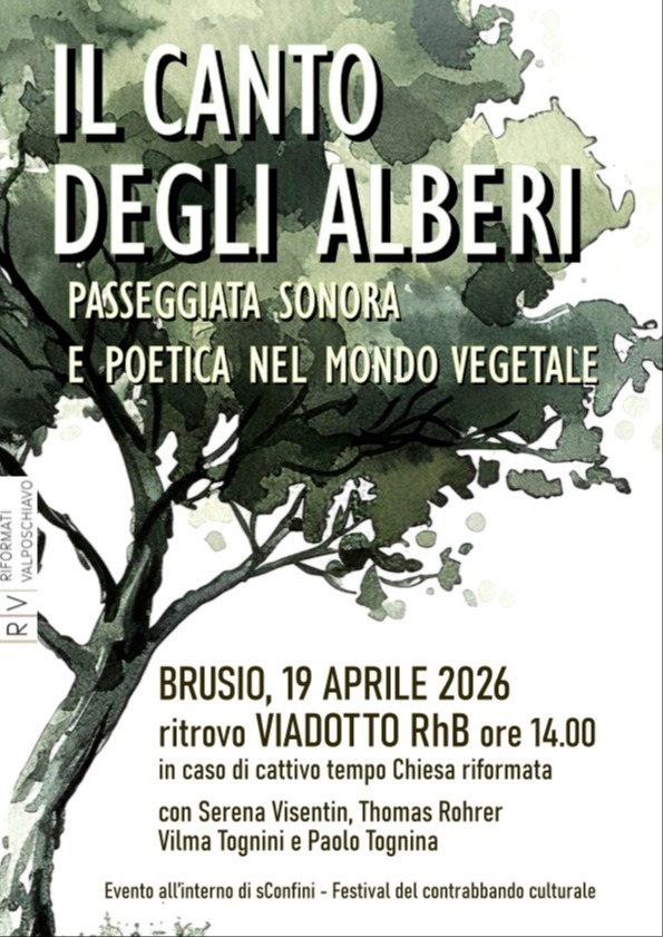 La passeggiata nel mondo vegetale, in programma a Brusio il 19 aprile, permetterà di ascoltare il “canto” degli alberi, proporrà l’ascolto di poesie dedicate alle piante, improvvisazioni musicali, spunti di riflessione a partire da testi biblici che parlano di alberi. Il percorso si concluderà, presso la chiesa riformata di Brusio, con uno spuntino dolce e salato a base di erbe selvatiche.