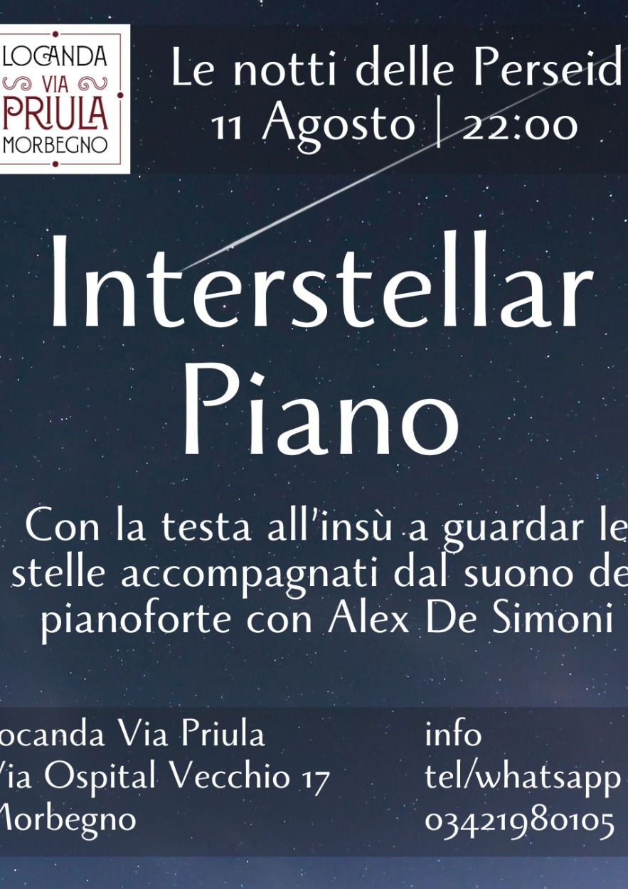 L’11 agosto 2025 alle 22:00, alla Locanda Via Priula di Morbegno (SO), serata sotto le stelle con Interstellar Piano: musica dal vivo di Alex De Simoni e osservazione delle Perseidi.