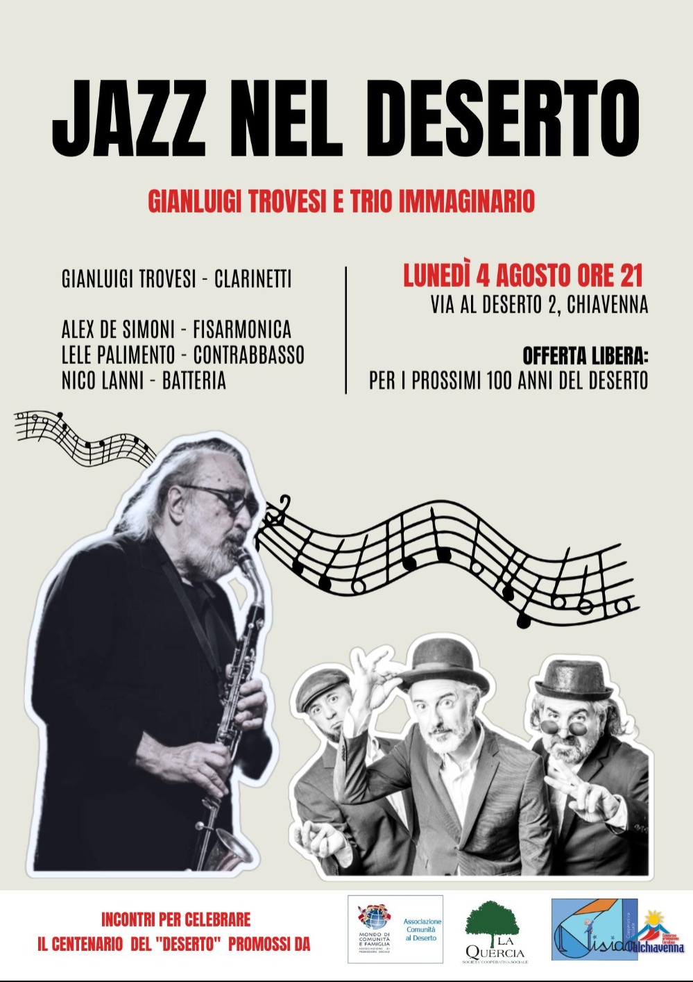 Un lunedì sera che esce dagli schemi: 4 agosto 2025, alle 21:00, in Via al Deserto 2 a Chiavenna (SO) va in scena Jazz nel Deserto, un concerto speciale per festeggiare i 100 anni del “Deserto”.