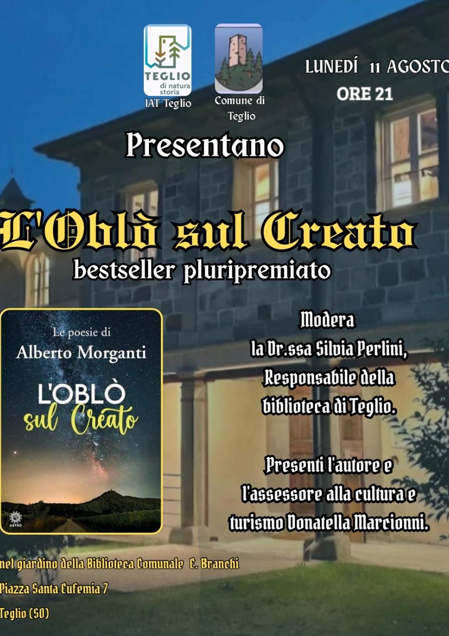 Lunedì 11 agosto 2025 alle 21:00, nel giardino della Biblioteca Comunale di Teglio (SO), presentazione del bestseller "L’Oblò sul Creato" di Alberto Morganti. Modera la dott.ssa Silvia Perlini, con l’autore e l’assessore alla cultura e turismo Donatella Marcionni.