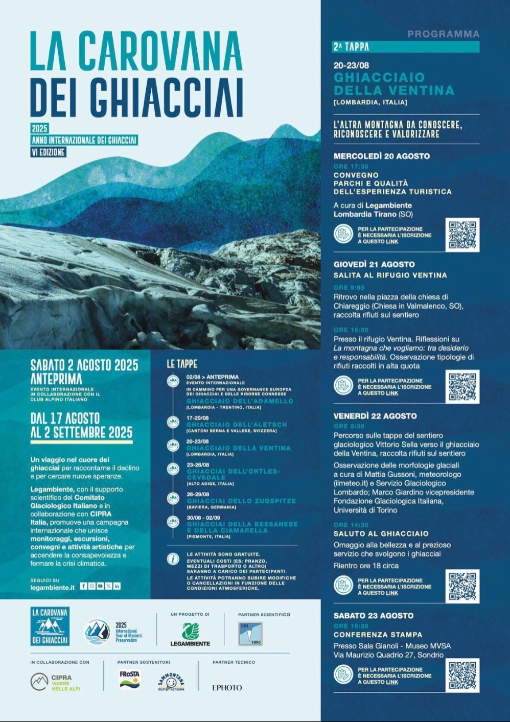 Dal 20 al 23 agosto 2025, il Ghiacciaio della Ventina sarà protagonista della seconda tappa de "La Carovana dei Ghiacciai", un progetto itinerante per osservare da vicino lo stato di salute dei ghiacciai alpini e riflettere su cambiamento climatico, turismo e sostenibilità.