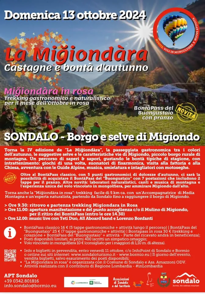 Per il mese dell'ottobre in rosa torna, d’intesa con il Comune e l’Associazione Amazzoni ODV, l'esperienza della “Miğiondàra in rosa”: trekking naturalistico e gastronomico da Sondalo a Migiondo con accompagnatrice di media montagna e botanica esperta del Parco Nazionale dello Stelvio.