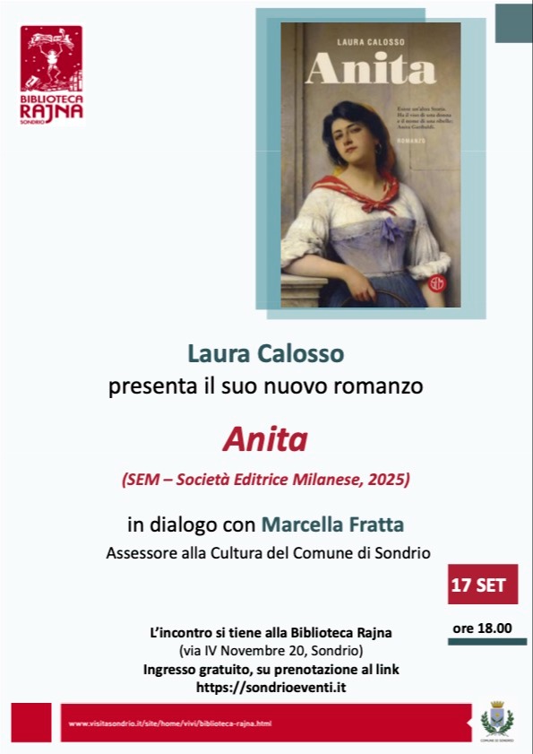 Una serata di cultura e letteratura ti aspetta a Sondrio (SO): il 17 settembre 2025, la scrittrice Laura Calosso sarà ospite della Biblioteca Rajna per presentare il suo nuovo romanzo “Anita”, edito da SEM – Società Editrice Milanese.