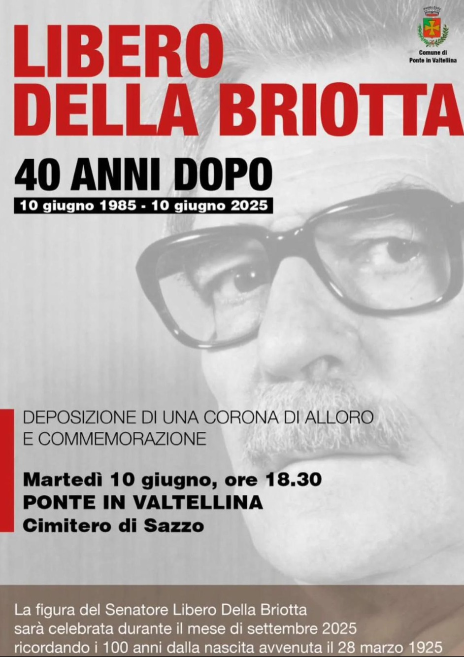 Il 10 giugno a Ponte in Valtellina (SO) si terrà una cerimonia commemorativa per i 40 anni dalla scomparsa del Senatore Libero Della Briotta, figura politica e sociale di riferimento per il territorio.