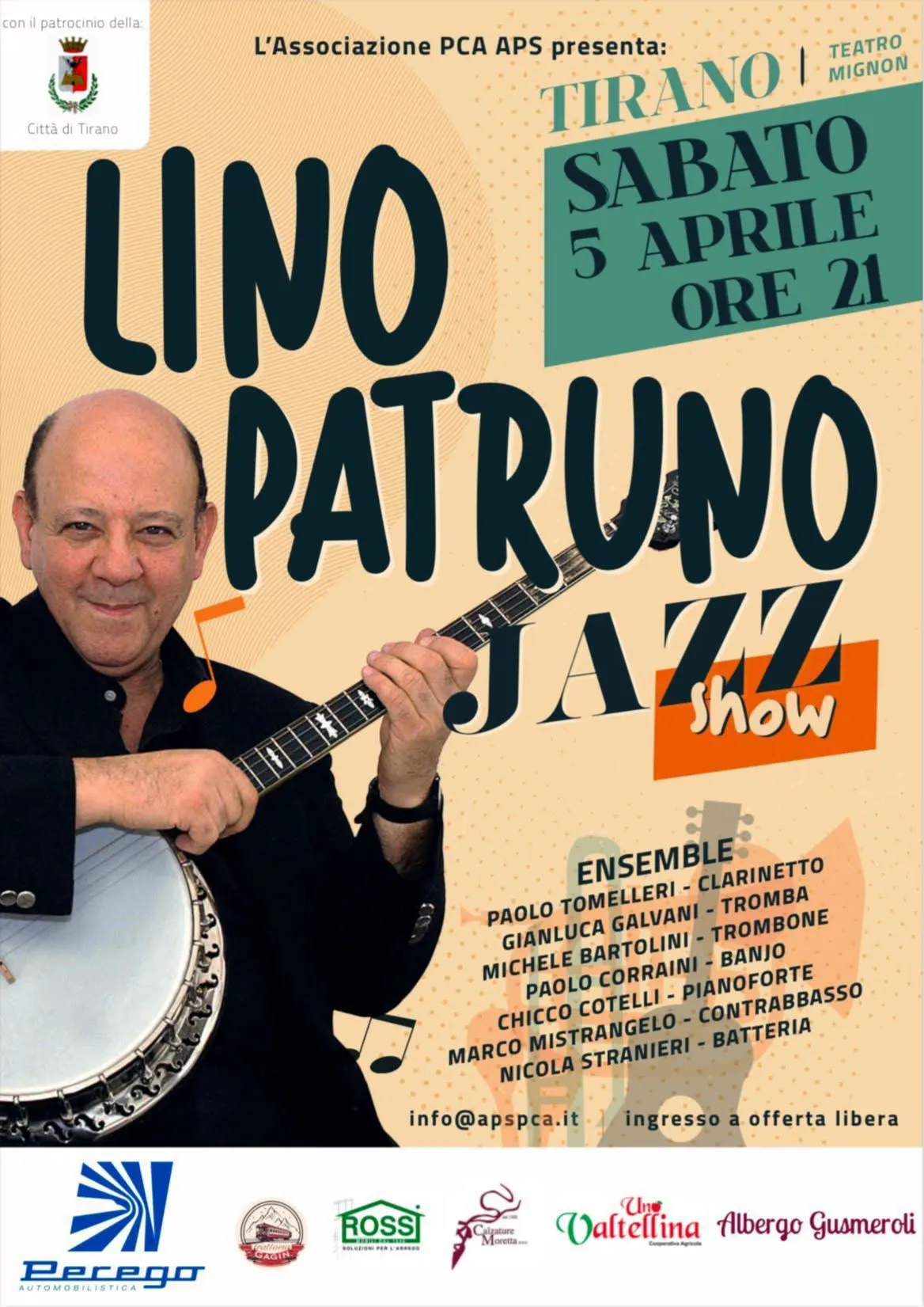 L’evento è organizzato dall’Associazione PCA APS, con il patrocinio della Città di Tirano, e porta sul palco un ensemble di grandi nomi del jazz italiano.