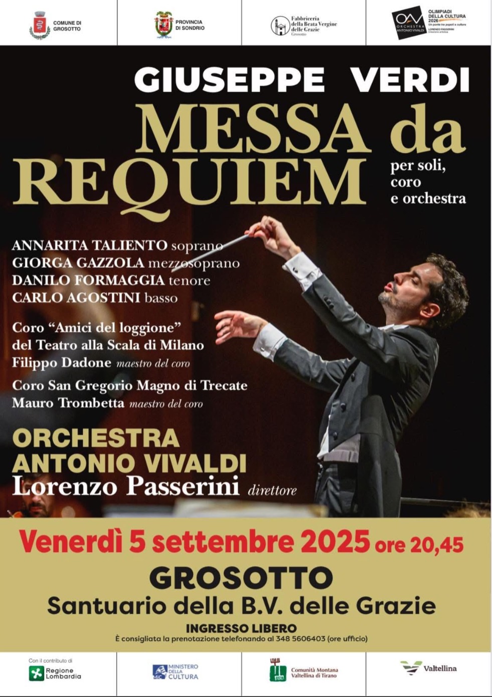 Se ami la grande musica e vuoi vivere una serata intensa e coinvolgente, segna questa data: venerdì 5 settembre 2025 a Grosotto (SO), nel suggestivo Santuario della Beata Vergine delle Grazie, va in scena uno dei capolavori assoluti di Giuseppe Verdi: la Messa da Requiem, per soli, coro e orchestra.