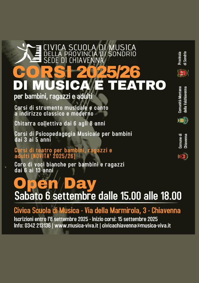La Civica Scuola di Musica della Provincia di Sondrio – Sede di Chiavenna apre le porte per farti scoprire tutto sui nuovi corsi 2025/26 di musica e teatro, pensati per bambini, ragazzi e adulti.