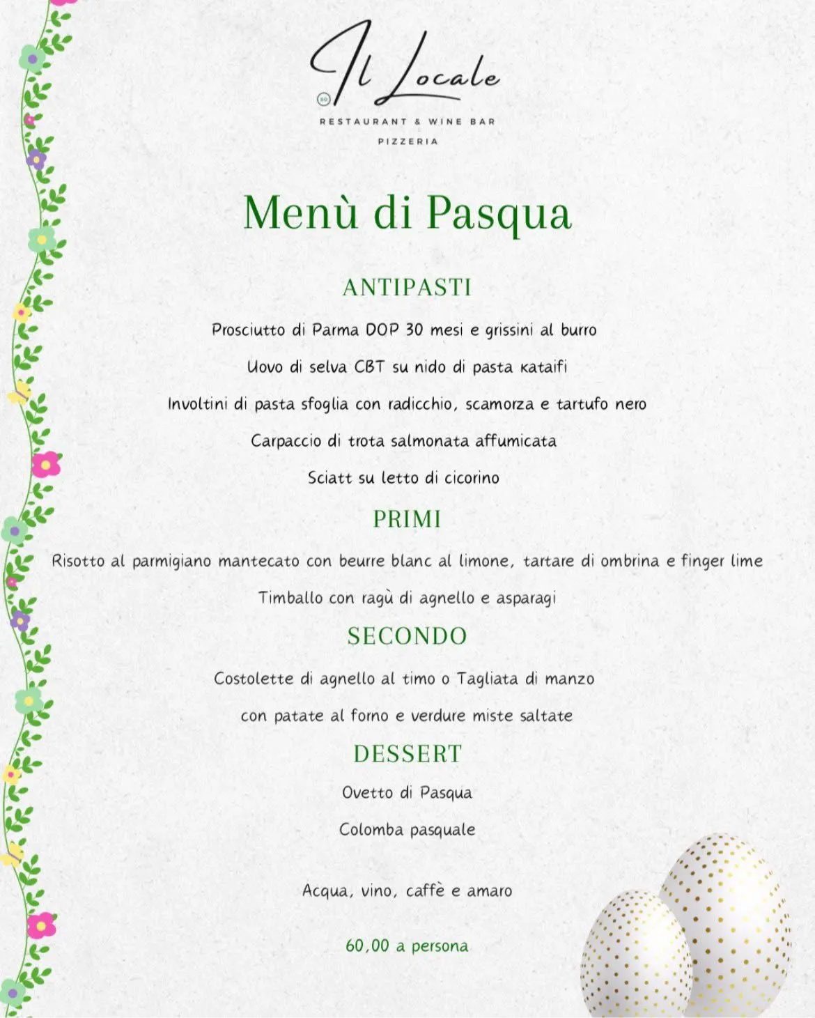 Per il pranzo di Pasqua, Il Locale ha preparato un menù completo, con proposte eleganti e ingredienti di qualità.