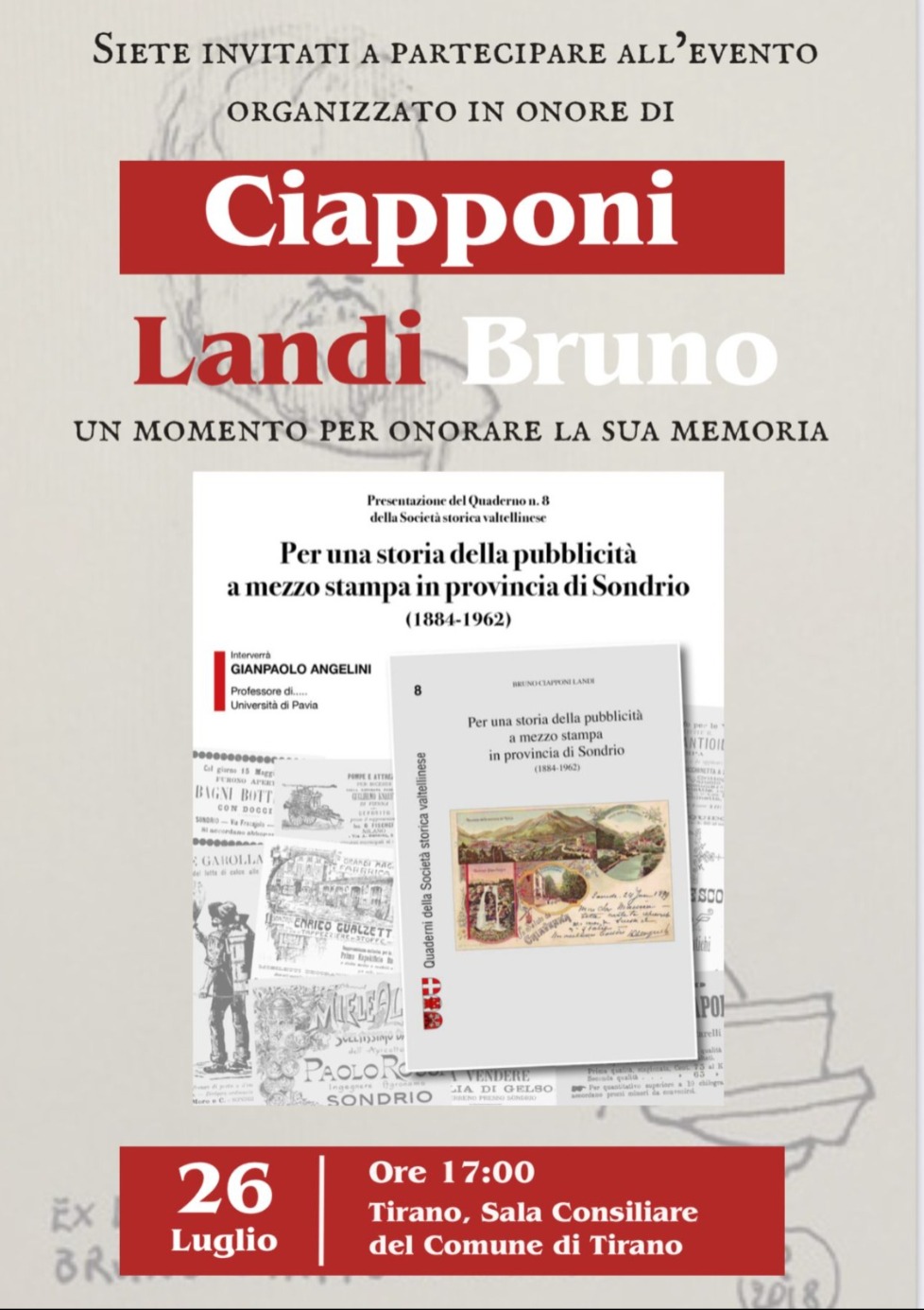 L’appuntamento è con la presentazione del Quaderno n. 8 della Società storica valtellinese, un approfondito lavoro firmato proprio da Bruno Ciapponi Landi. Il volume ripercorre quasi 80 anni di pubblicità a stampa nella provincia di Sondrio, raccontando l’evoluzione della comunicazione commerciale e culturale tra Otto e Novecento.