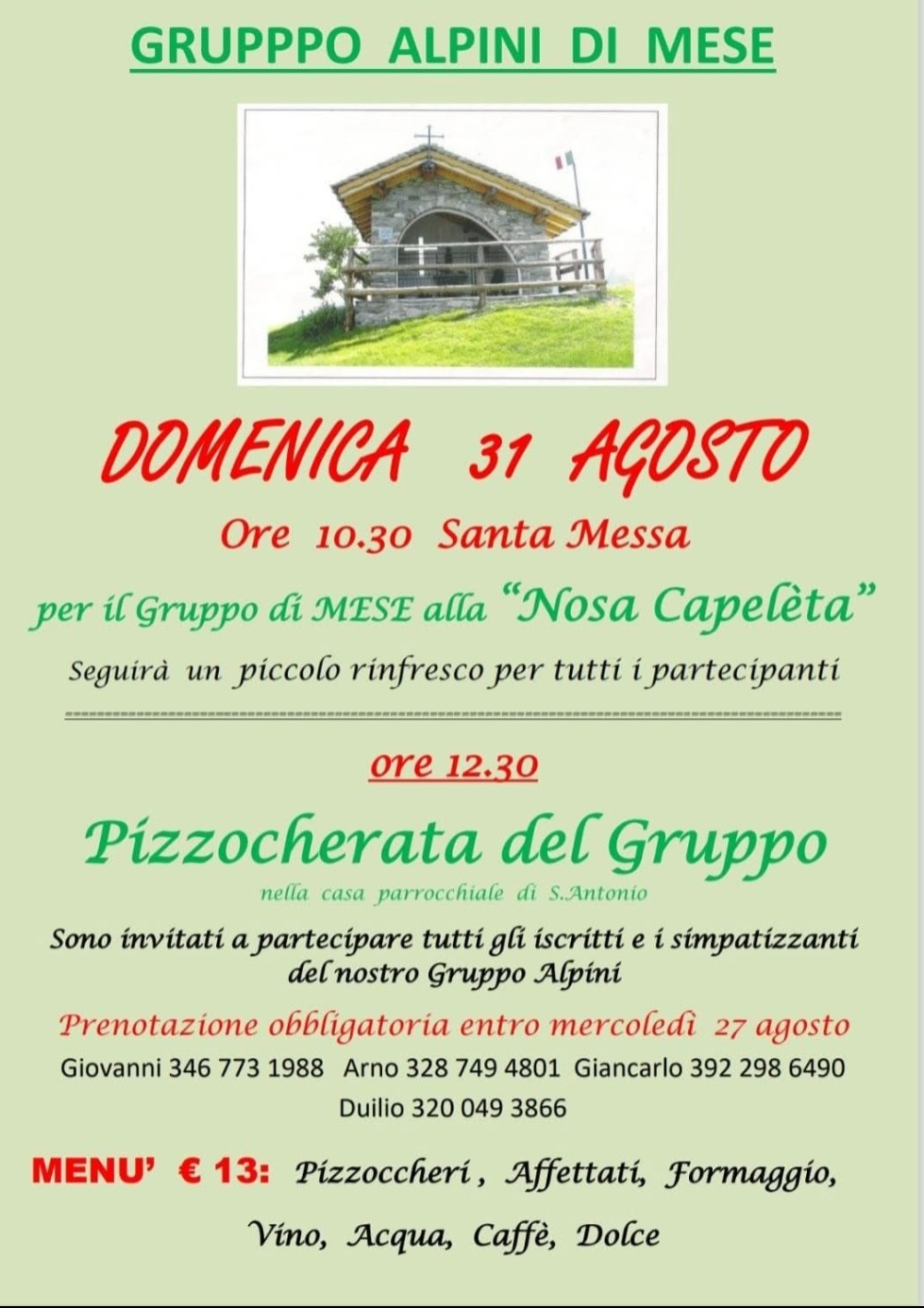 Domenica 31 agosto 2025 il Gruppo Alpini di Mese (SO) ti invita a partecipare a una giornata speciale con Santa Messa e la tradizionale Pizzoccherata del Gruppo.