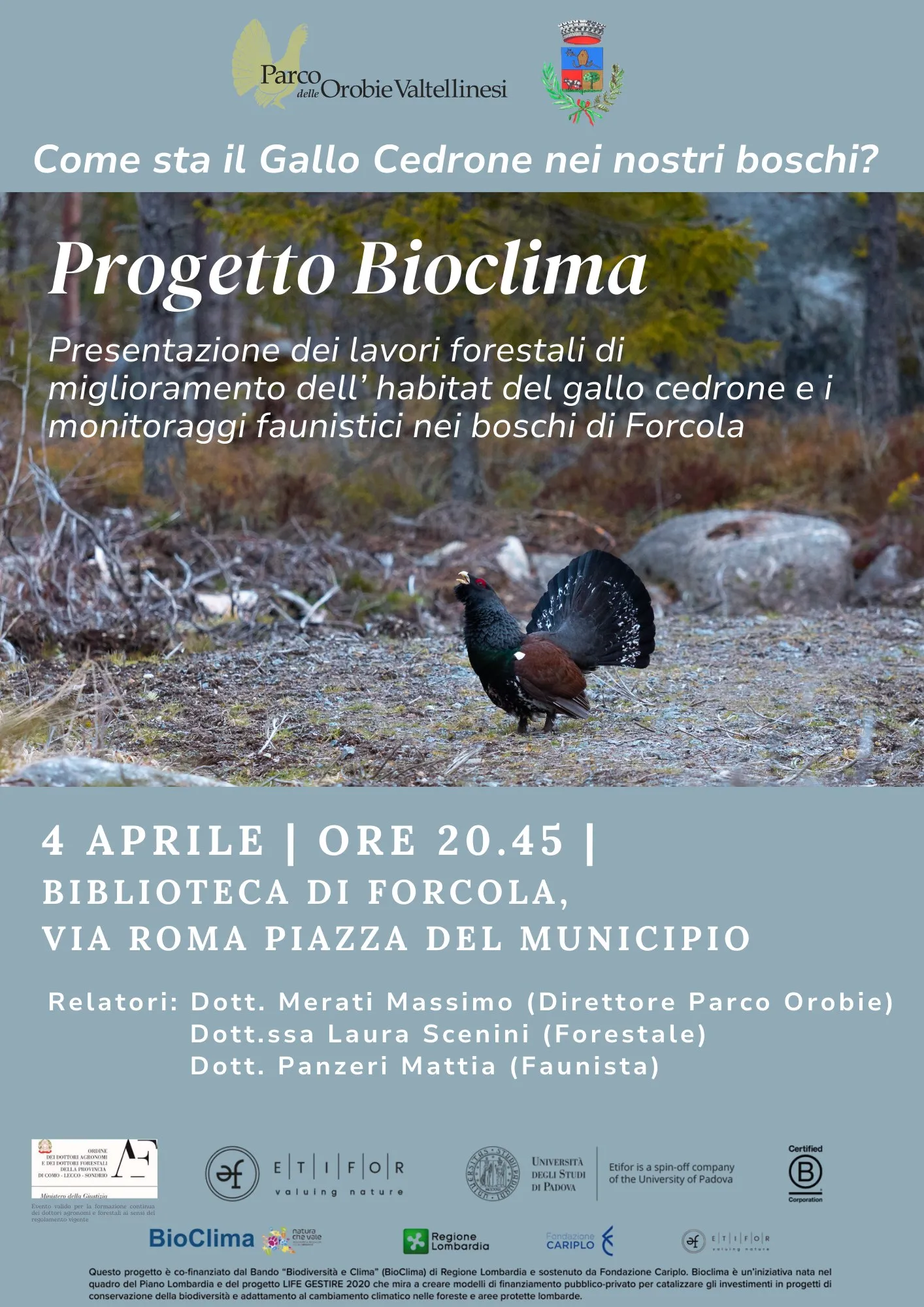 Una serata aperta a tutti, pensata per raccontare in modo chiaro e dettagliato cosa sta succedendo nei boschi di Forcola (SO), dove è in corso un lavoro di miglioramento dell’habitat del gallo cedrone, una delle specie simbolo della nostra biodiversità alpina.