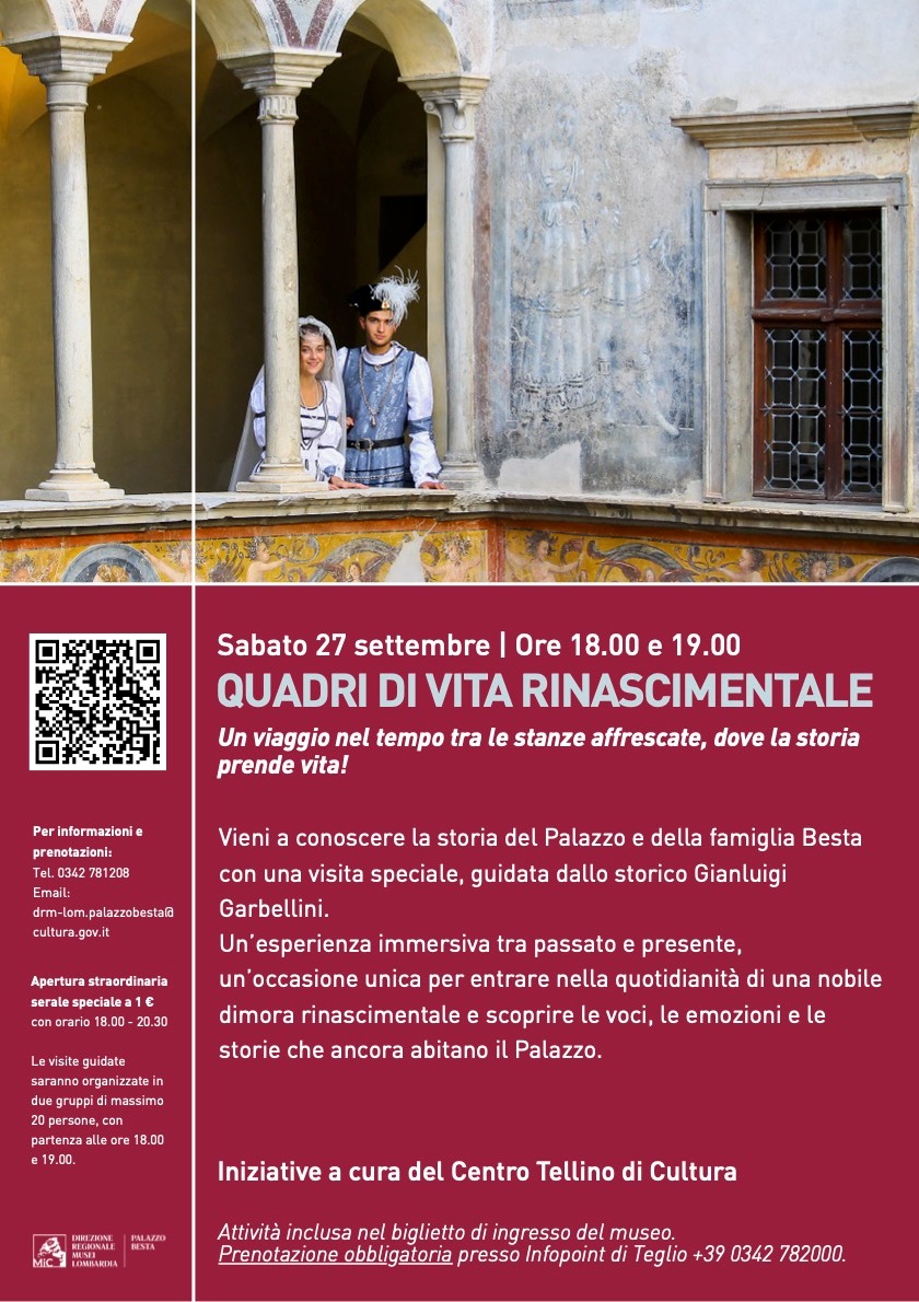 Grazie alla guida dello storico Gianluigi Garbellini, i visitatori avranno l’opportunità di conoscere la storia del Palazzo e della famiglia Besta, vivendo un vero salto indietro nel tempo. Sarà possibile rivivere atmosfere, emozioni e racconti che ancora abitano la dimora rinascimentale, immergendosi nella quotidianità di un’epoca lontana.
