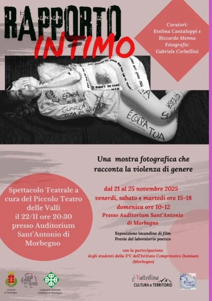 "Rapporto Intimo”, un'iniziativa in programma a Morbegno (SO) dal 21 al 25 novembre 2025 presso l’Auditorium Sant’Antonio, con una mostra fotografica e uno spettacolo teatrale che affrontano il tema della violenza di genere.