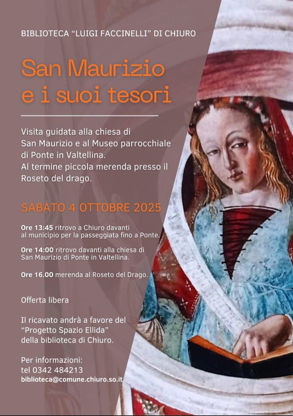 Sabato 4 ottobre 2025 la Biblioteca Luigi Faccinelli di Chiuro ti invita a scoprire San Maurizio e i suoi tesori con una visita guidata alla chiesa e al Museo parrocchiale di Ponte in Valtellina.