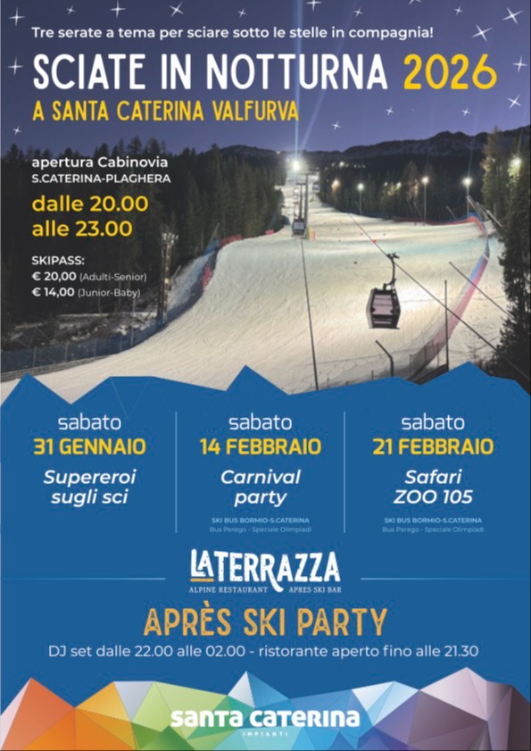 Le due sciate di febbraio (14 e 21) si svolgeranno durante il periodo olimpico in cui ci sarà un potenziamento degli orari del trasporto pubblico – Bus Perego (linea A073); sarà quindi possibile sfruttare tale servizio attivo fino alle ore 23.50 ( ultima corsa da S.Caterina Valfurva verso Bormio )