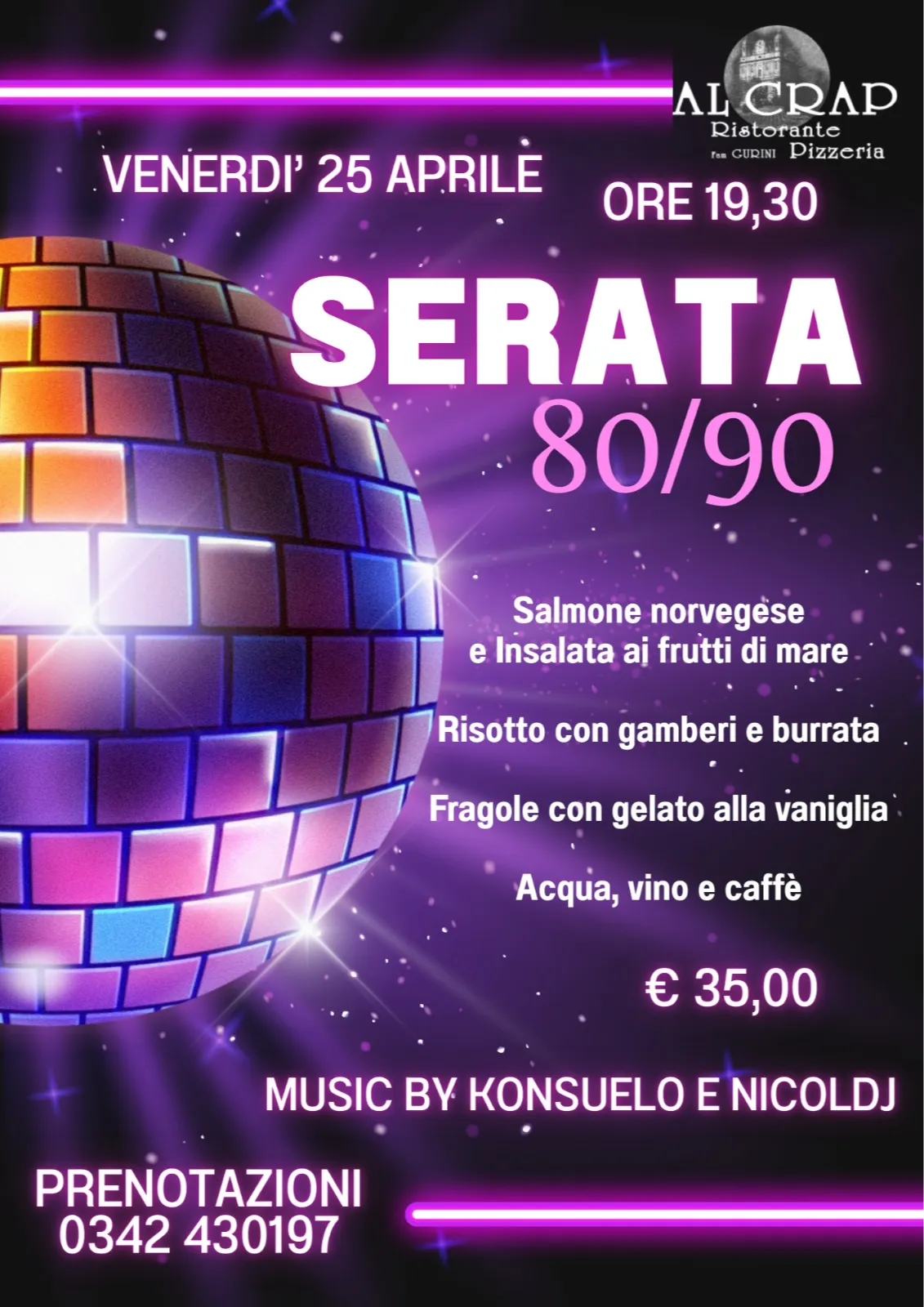 Se hai voglia di rivivere l’energia degli anni ’80 e ’90 tra buon cibo e musica tutta da ballare, non perdere la Serata 80/90 organizzata dal Ristorante Al Crap di Tresivio (SO) per venerdì 25 aprile 2025, con inizio alle ore 19:30.