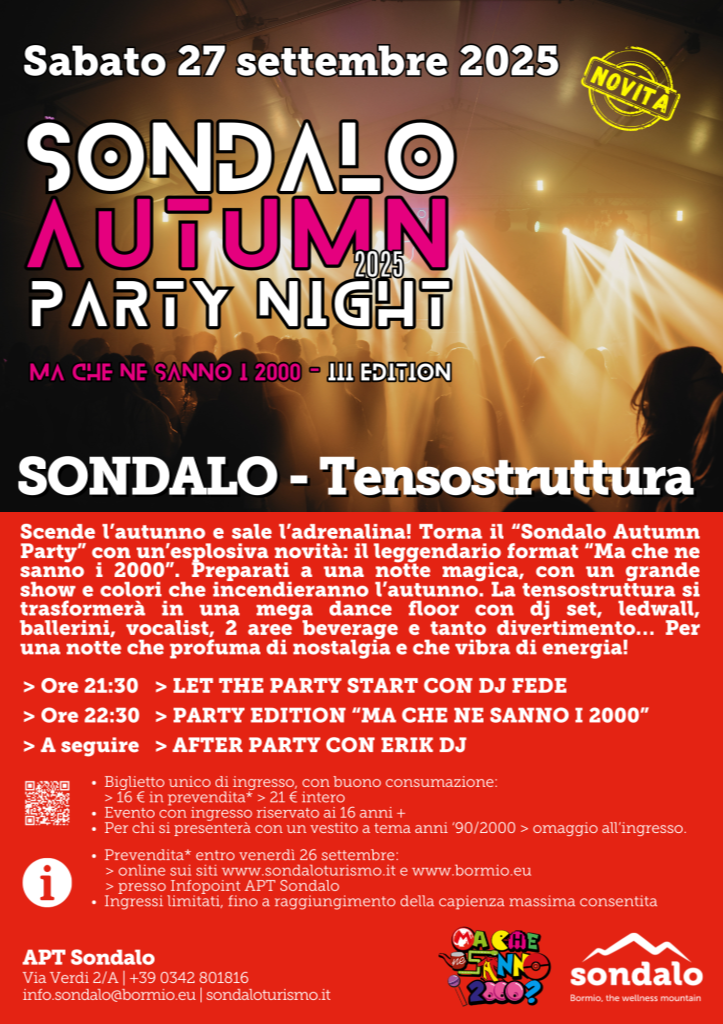 Sabato 27 settembre 2025 torna a Sondalo (SO) il Sondalo Autumn Party Night, giunto alla sua terza edizione e già diventato un appuntamento imperdibile per chi ama ballare, divertirsi e lasciarsi trasportare dall’energia della musica.