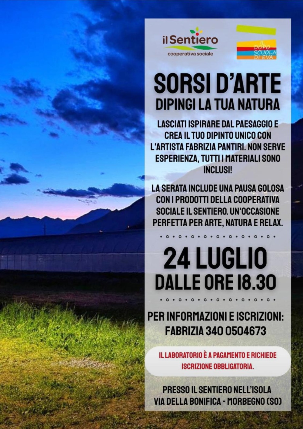 “Sorsi d’Arte” è un laboratorio organizzato da Il Doposcuola di Eva in collaborazione con la Cooperativa Sociale Il Sentiero. L’appuntamento è con l’artista Fabrizia Pantiri, che ti guiderà nella realizzazione di un dipinto unico ispirato al paesaggio che ti circonda. Non serve alcuna esperienza: tutti i materiali sono inclusi.