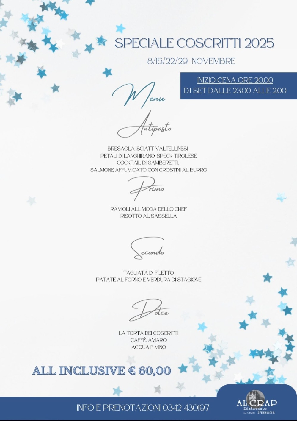 Il Ristorante Al Crap propone quattro serate imperdibili con menù completo all inclusive a 60€, DJ set e tanto divertimento.