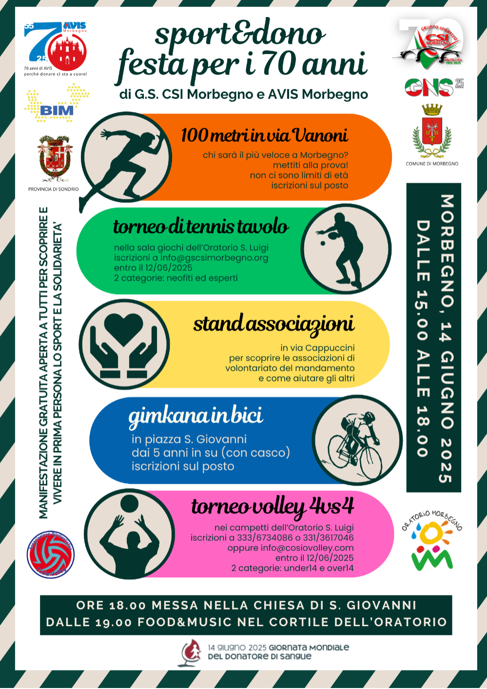 Una giornata piena di energia, gioco e condivisione: il G.S. CSI Morbegno e AVIS Morbegno celebrano 70 anni con una grande festa aperta a tutti.