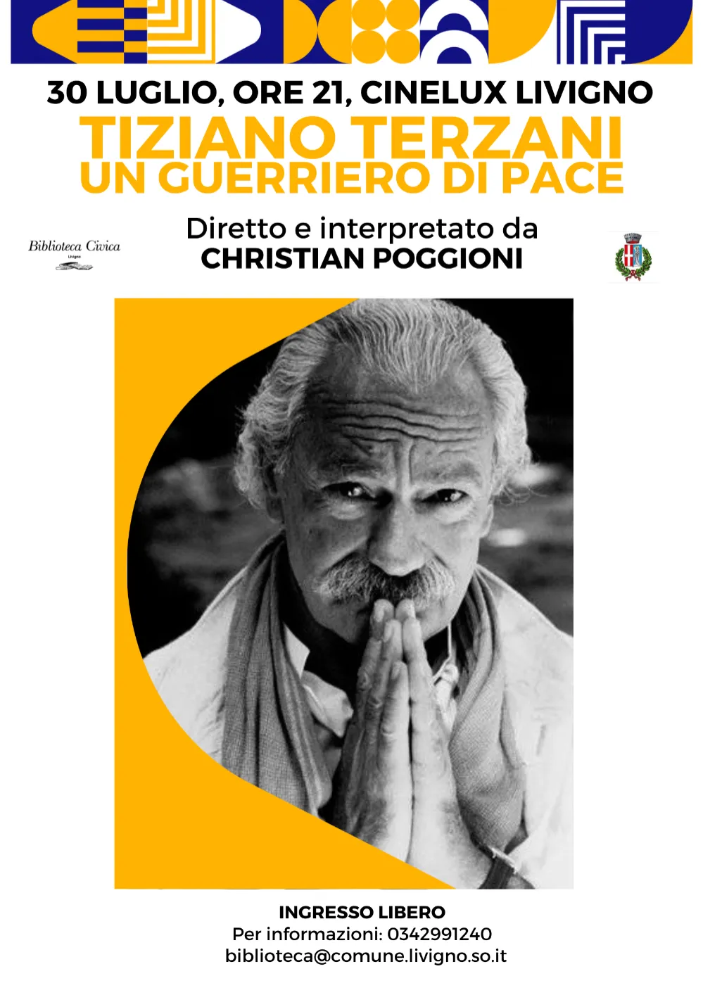 Mercoledì 30 luglio alle 21 presso il Cinelux di Livigno, Christian Poggioni, diplomato alla scuola del Piccolo Teatro di Milano con Giorgio Strehler, porterà sul palco un omaggio alla figura di Tiziano Terzani.