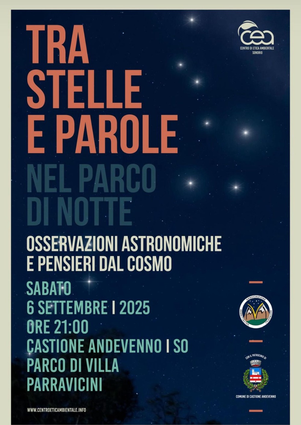 Hai mai guardato il cielo di notte chiedendoti cosa ci sia davvero là fuori? Sabato 6 settembre nel suggestivo Parco di Villa Parravicini a Castione Andevenno (SO) puoi farlo in compagnia, con una serata che unisce scienza, bellezza e pensieri.