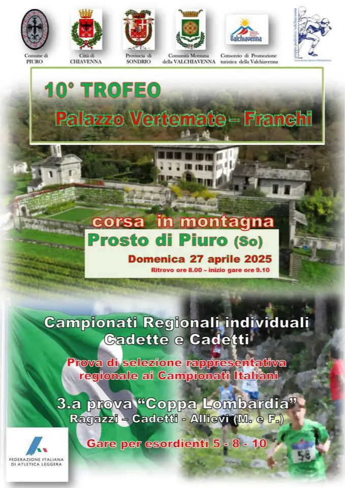 Domenica 27 aprile 2025 torna a Prosto di Piuro (SO) il prestigioso appuntamento con la 10ª edizione del Trofeo Palazzo Vertemate-Franchi, gara di corsa in montagna inserita nel calendario regionale della Federazione Italiana di Atletica Leggera.