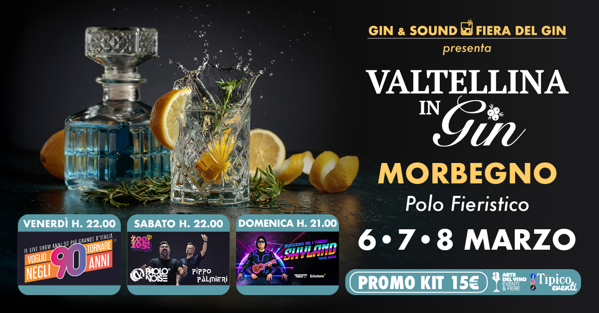 Dal 6 all’8 marzo 2026 torna a Morbegno (SO) una speciale edizione di Gin & Sound: VALTELLINA IN GIN, la fiera dedicata al gin firmata Tipico Eventi e Arte del Vino. Nei padiglioni del Polo Fieristico di Morbegno (Via Strada Comunale di Campagna) sarà possibile scoprire, degustare, acquistare e conoscere una selezione di gin, dai più noti alle etichette di nicchia, con un format che unisce fiera + intrattenimento grazie a tre serate show da non perdere.