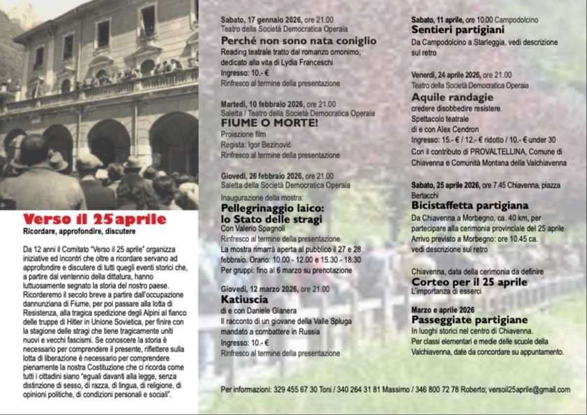 “Verso il 25 aprile” è il titolo della rassegna in programma tra gennaio e aprile 2026 in Chiavenna e Campodolcino, promossa dal Comitato “Verso il 25 aprile”. Il progetto propone iniziative e incontri per ricordare, approfondire e discutere il significato del 25 aprile, con appuntamenti dedicati alla storia, alla memoria e alla Resistenza.