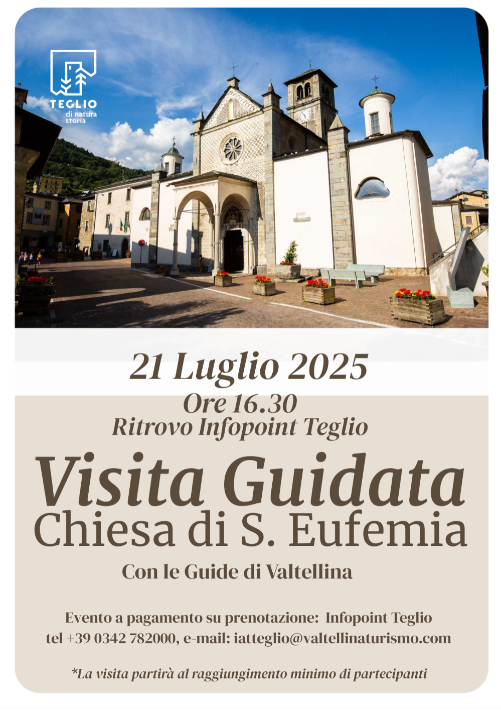 Una proposta imperdibile per chi ama l’arte e la storia in Valtellina: lunedì 21 luglio potrai partecipare a una visita guidata alla Chiesa di S. Eufemia, uno dei luoghi simbolo di Teglio (SO). Accompagnato dalle Guide di Valtellina, scoprirai dettagli e curiosità su questa chiesa dal grande valore storico e culturale.