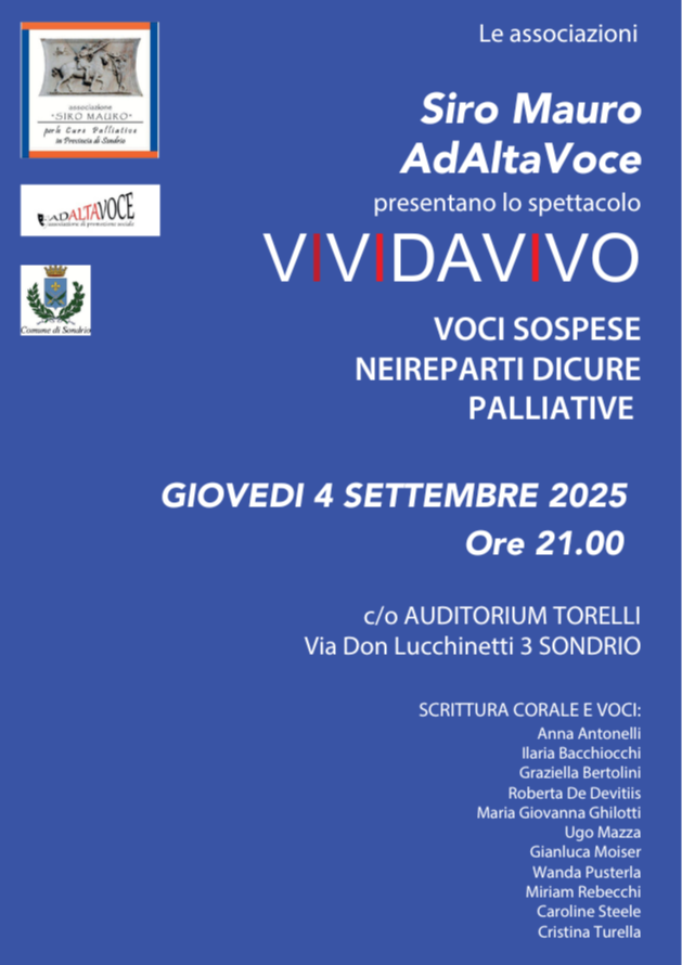 Una serata di teatro intensa e toccante ti aspetta a Sondrio con VIVIDAVIVO – Voci sospese nei reparti di cure palliative, lo spettacolo promosso dall’Associazione Siro Mauro e messo in scena dagli attori e dalle attrici dell’Associazione AdAltaVoce.