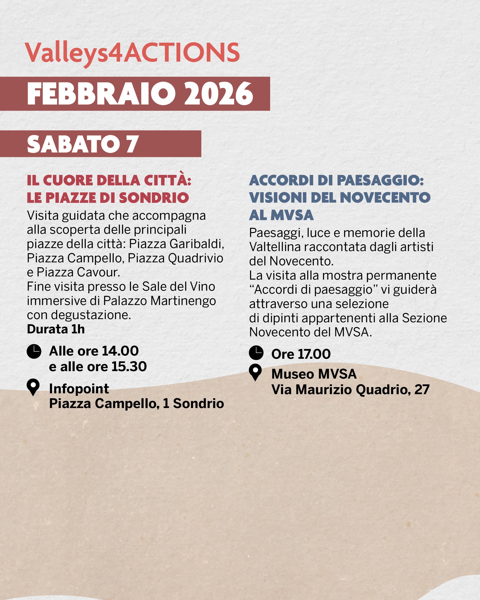 SONDRIO SEGRETA: 25 SECOLI DI STORIE Scorci, segreti e vicende che hanno costruito la città. In questa visita scoprirete scorci, vicende e dettagli nascosti attraverso fotografie storiche, modelli e mappe, che restituiscono la trama della città tra passato e presente. 🕐 Ore 17.00 📍 Museo MVSA Via Maurizio Quadrio, 27