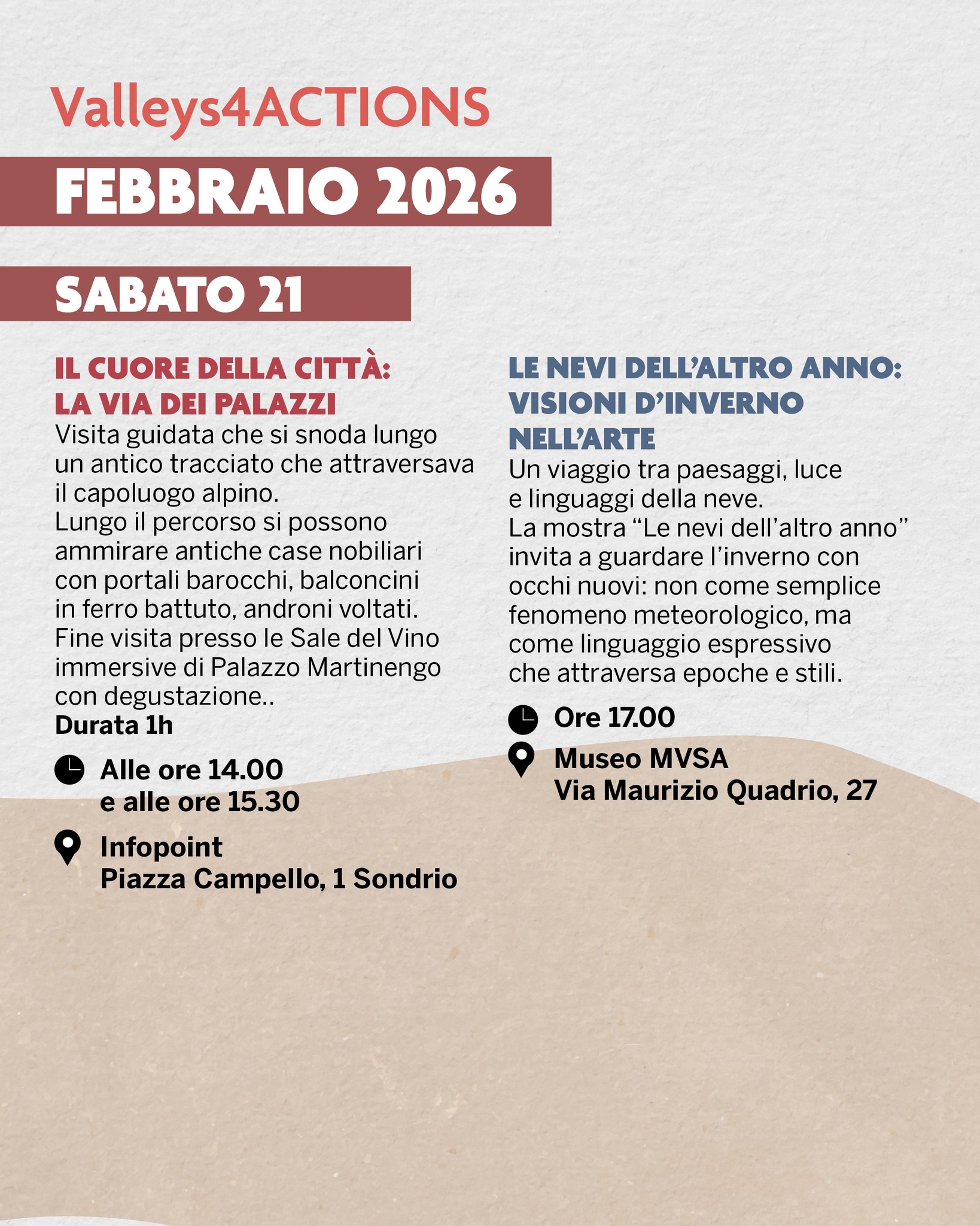 A febbraio, mentre i giochi olimpici accendono i riflettori sulle competizioni, Sondrio propone, in sinergia con i Winter Events in Piazza Garibaldi, una proposta culturale per vivere il nostro bellissimo territorio a tutto tondo!