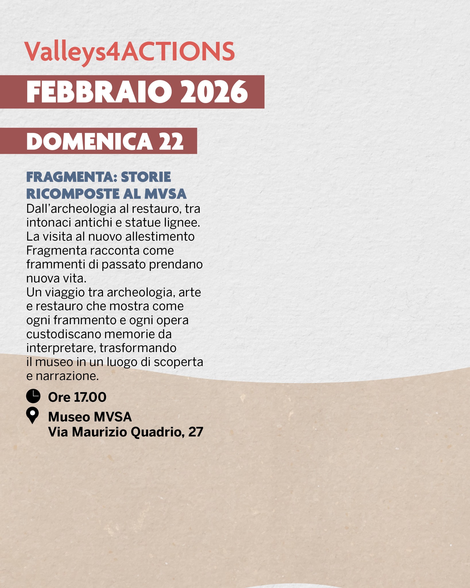 SABATO 14 ARCHEOLOGIA DELLA VALTELLINA: SEGNI E STORIE Reperti, oggetti e gesti quotidiani delle antiche comunità che abitavano le nostre valli. La visita alla sezione Archeologia del MVSA permette di scoprire la Valtellina attraverso le tracce materiali lasciate dai suoi abitanti nel corso dei secoli. 🕐 Ore 17.00 📍 Museo MVSA Via Maurizio Quadrio, 27
